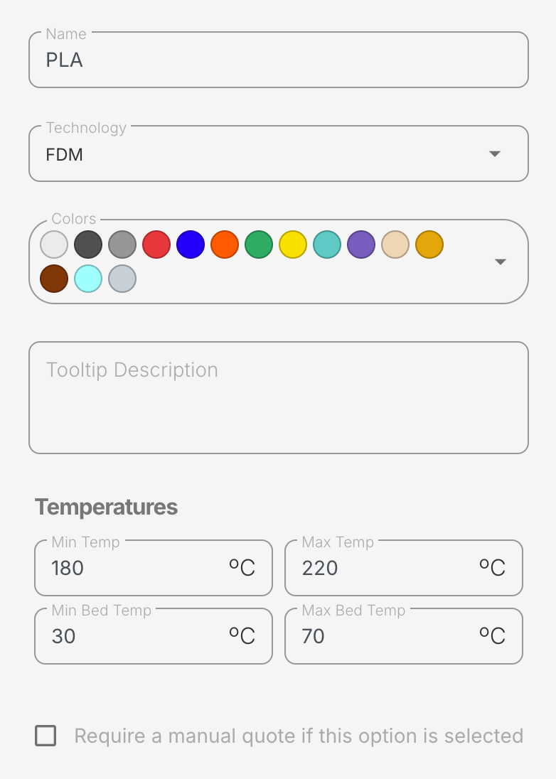 Next, click Add New Material. Here, you can set the name, color options, description, temperature properties, pricing options, material properties, and more.
